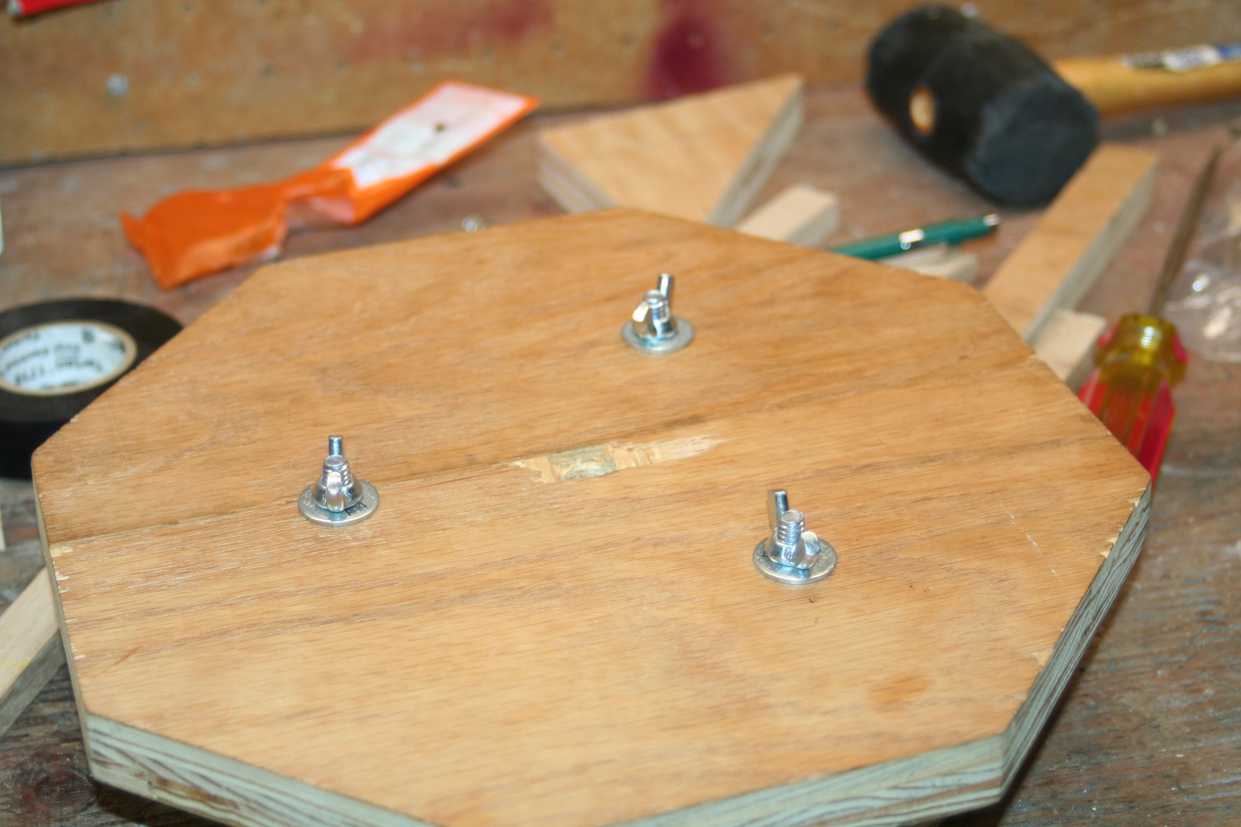 | 27. (5/1/2007) I found nine small screws which I will use for the mirror supports. They will be screwed in at each corner of the triangles. They will also be covered up with some sort of soft material to make sure too much pressure is not exerted on the bottom of the mirror. | ![]() |